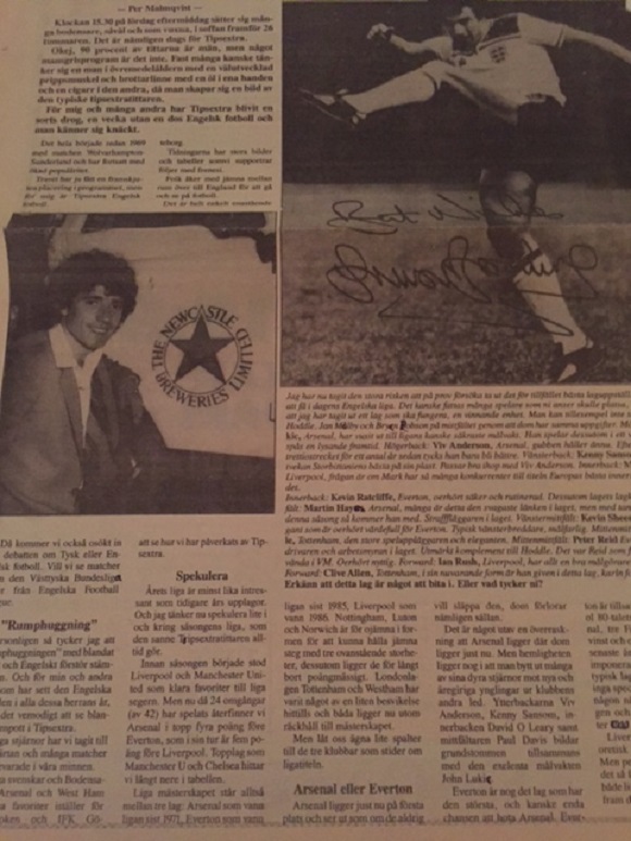 Givetvis kunde jag inte hålla mig ifrån engelsk fotboll. Den lokala anknytningen motiverade jag med att de två fotografierna med autografer – föreställande West Hams elegant Trevor Brooking och Kevin Keegan som gjorde reklam för Newcastle Breweries – faktiskt fanns hemma hos mig i Boden och att skriva och be om autografer var något vi lokalungdomar gärna gjorde. Givetvis en lögn, eftersom en sextonåring knappast skriver och frågar efter autografer. Vore ju att bruka våld på ens eget coolhetsvarumärke. Men eftersom jag skrev om det, så kan jag inte ha varit så rädd. Eller så var jag bara korkad. Eller desperat att komma på ämnen. Säkert alla tre.